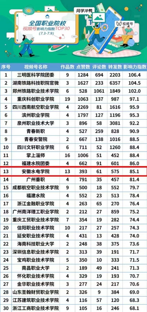 7月12日,在中国青年报、中青校媒,联合腾讯微信团队公布的全国职业院校视频号影响力排行榜中,安徽水利水电职业技术学院官方微信视频号入选全国职业院校视频号30强,位列第13位!