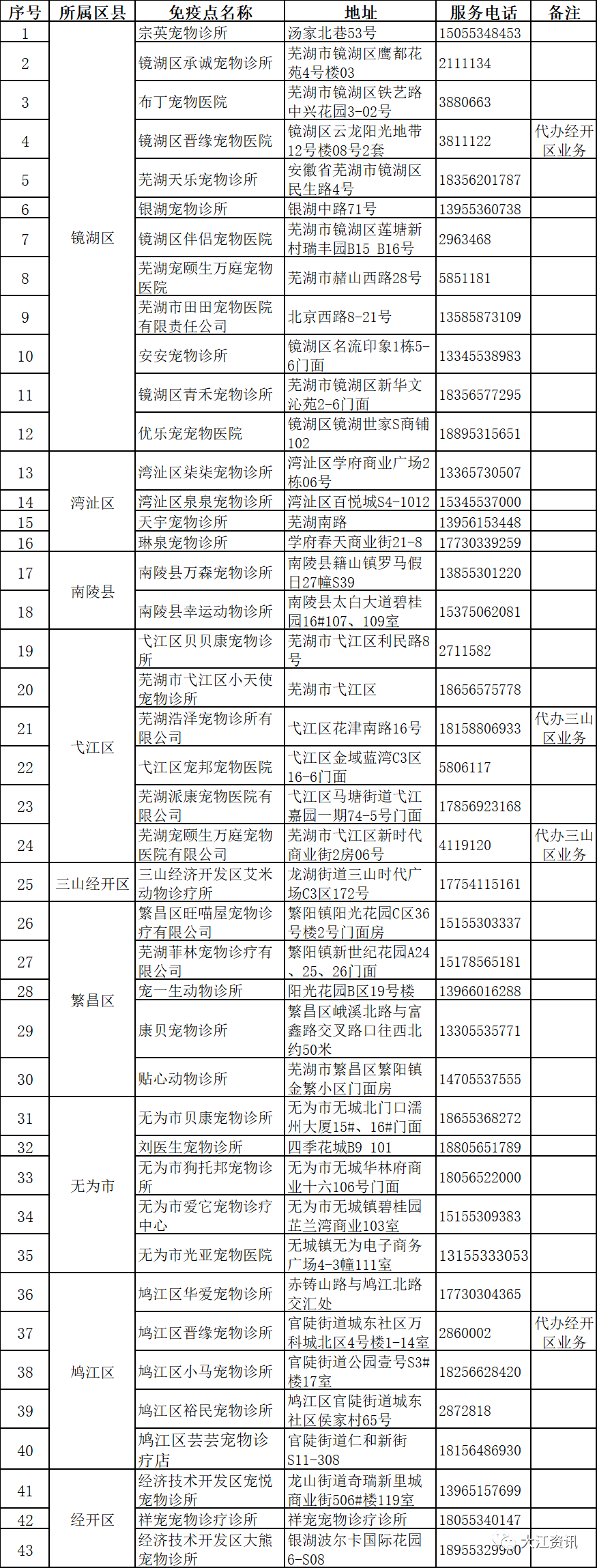 日前,我市公布了最新犬只免疫登记一站式服务点(附文尾),截至目前,全市犬只免疫登记一站式服务点共计43家,其中,镜湖区12家、湾沚区4家、南陵县2家、弋江区6家、三山经开区1家、繁昌区5家、无为市5家、鸠江区5家、经开区3家。