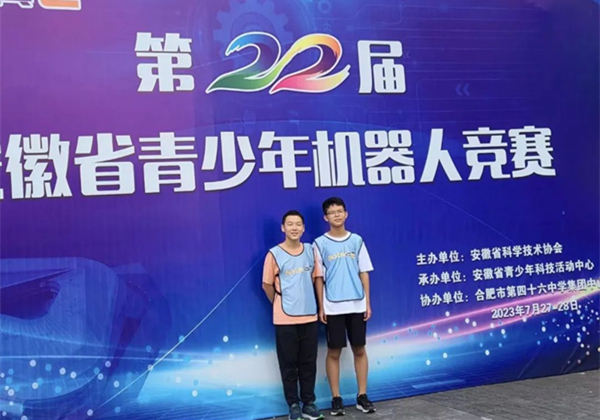 第22届安徽省青少年机器人竞赛于7月26日—28日在合肥市四十六中学中山路校区举行。合肥市五十中学东校西园校区两支队伍在机器人创新挑战赛项目中包揽省冠亚军!七(2)班杨乔轩和黄徐嘉同学获得安徽省冠军;七(6)班路畅宇和洪思宸同学获得安徽省亚军。
