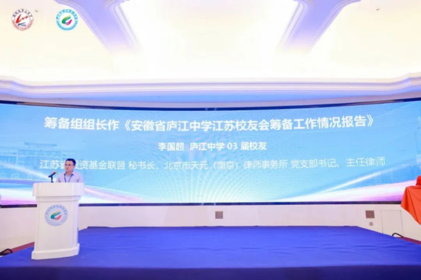 领导致辞后,安徽省庐江中学江苏校友会筹备组组长李国超向大会作《安徽省庐江中学江苏校友会筹备工作情况报告》。紧接着,庐江中学04届校友、泰熙资产合伙人吴立根向大会宣读及提请大会表决通过了《安徽省庐江中学江苏校友会管理条例(草案)》;庐江中学80届校友,南京审计大学三级教授,经济学院原副院长、期刊社原社长许成安向大会宣读了拟任安徽省庐江中学江苏校友会首届理事会理事,常务理事、名誉会长、会长、副会长、监事、秘书长、常务秘书长、副秘书长以及顾问建议名单并提请大会表决通过。大会中邢建国、谈家东、许克琪、姚守应、吴业苗、钱晓萍、李中兵、叶宝流当选校友会荣誉会长,周宏兵担任校友会会长,李国超担任校友会秘书长,许成安担任校友会监事长。