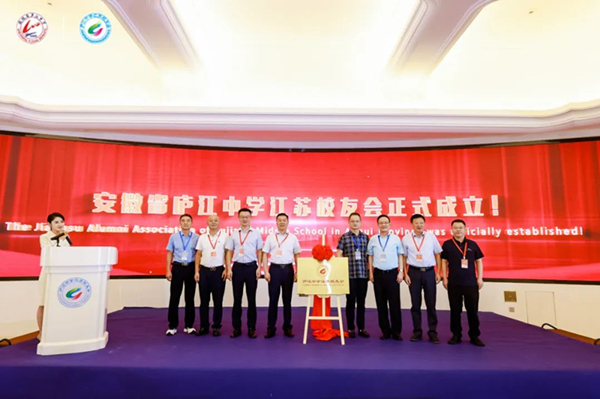 袁国道向庐江中学江苏校友会会长新任会长周宏兵授旗,并为江苏校友会负责人等颁发聘书;俞德胜、袁国道、周丽华、谈家东、李中兵、叶宝流和周宏兵,共同为庐江中学江苏校友会揭牌。至此,江苏校友会正式成立!周宏兵会长在发言中表示,庐江中学江苏校友会将积极汇聚校友力量、促进母校发展,并努力回报家乡。