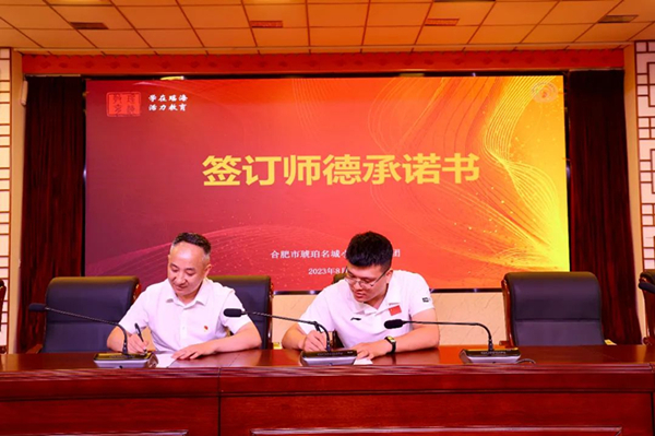 在师德师风建设培训会上,学校党总支书记、校长崔世峰与三个校区教师代表签订师德师风工作承诺书,并带领全体老师进行师德宣誓。崔世峰以“五心服务引领学校内涵式发展”为主题,深入浅出地阐述了以党建引领师德师风水平提升的思考与实践。学校通过开展“交心”谈话,让思想统一起来;书写“知心”家书,让工作支持起来;打造“暖心”阵地,让活力激发起来;培育“热心”队伍,让服务行动起来;搭建“贴心”平台,让教师发展起来。
