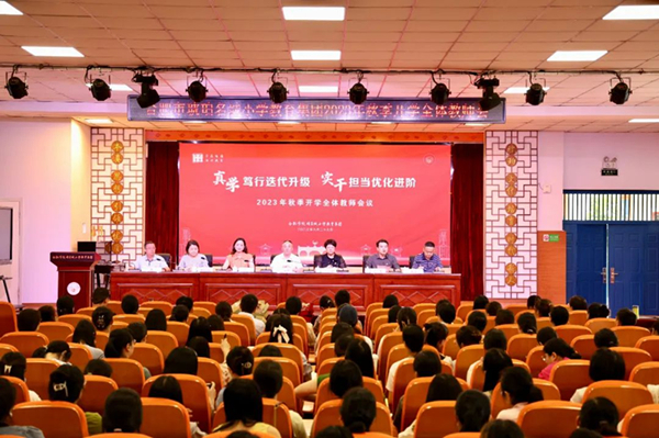 新交流的校级干部与全体教师见面并发表感言,耿晨宣讲了“学在瑶海 活力教育”十大行动的“11310”发展体系并传达了学校2023年秋季开学工作会议精神。