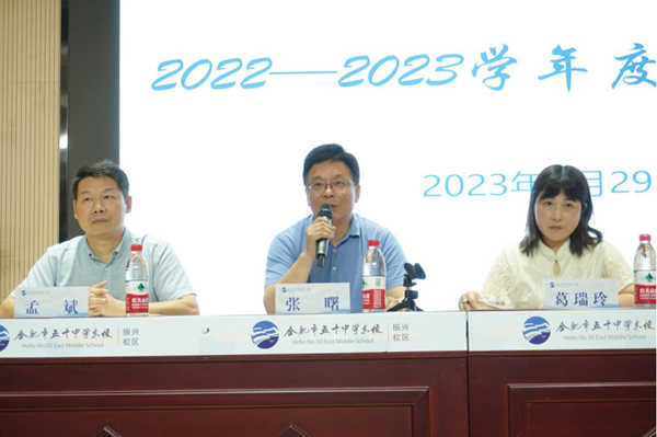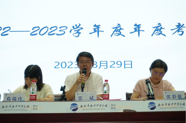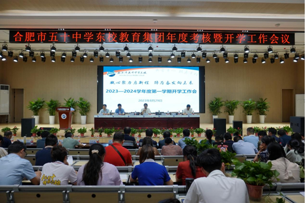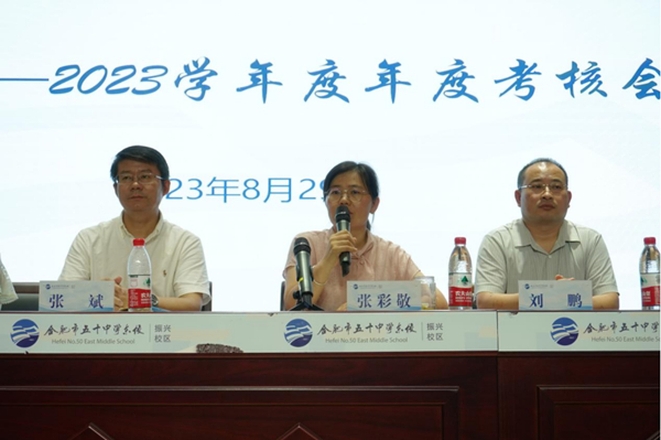 凝心聚力启新程,踔厉奋发向未来。为扎实做好开学前各项准备,确保新学期开学工作有序进行,8月29日上午,合肥市五十中学东校教育集团举行了2022-2023学年度考核暨2023-2024学年度第一学期开学工作会。蜀山区教体局副局长张彩敬、蜀山区教体局党委委员、副局长、合肥市五十中学东校党委书记、校长张斌、蜀山区教体局组织人事科葛瑞玲、刘鹏、西园校区执行校长张曙、望江路校区执行校长李燕涛、振兴校区执行校长孟斌出席会议,全体教职工及新入职教师参会。大会由张斌主持。