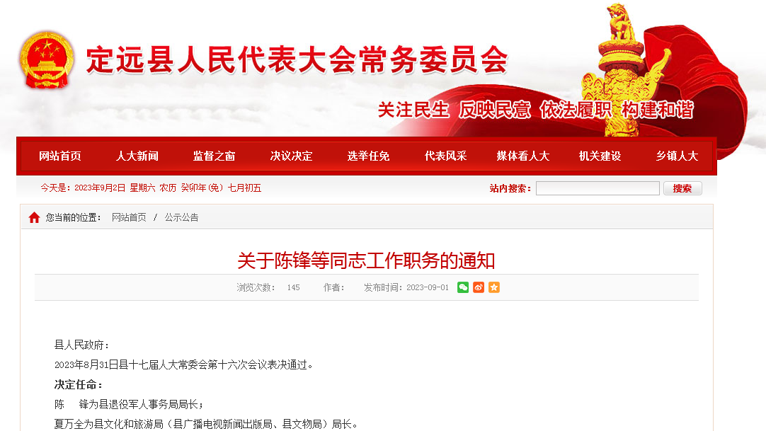 2023年8月31日,定远县第十七届人民代表大会常务委员会第十六次会议通过人事任免事项。