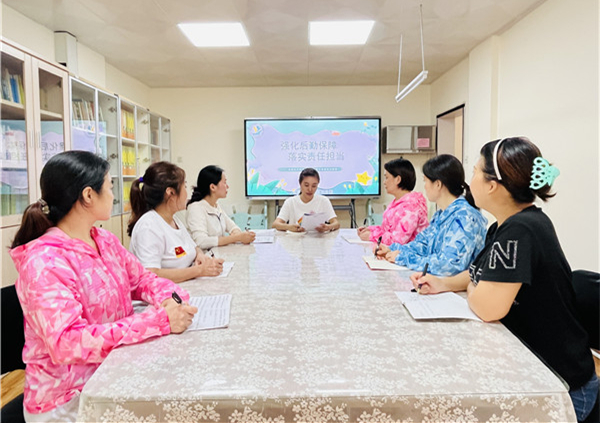 后勤负责于露老师首先对近期园所卫生清洁、保育工作、安全防护、食品安全等方面工作进行回顾和总结,肯定和鼓励后勤人员的工作态度和热情,并提出更高的标准和要求:全体后勤人员要牢固树立“后勤服务先行”的原则,明确职责,细化落实,认真做好后勤保障工作。