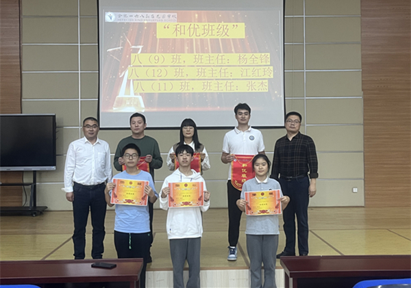 会议第三项,主持人宣读各班“和乐少年”“和跃少年”学生名单。由各班班主任亲自为获奖学生们颁发了奖状。接下来校领导为阶段表现优异的班级颁发了“和优班级”奖状与荣誉锦旗。
