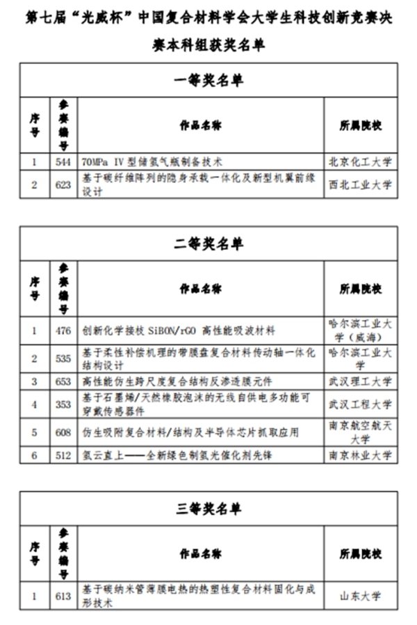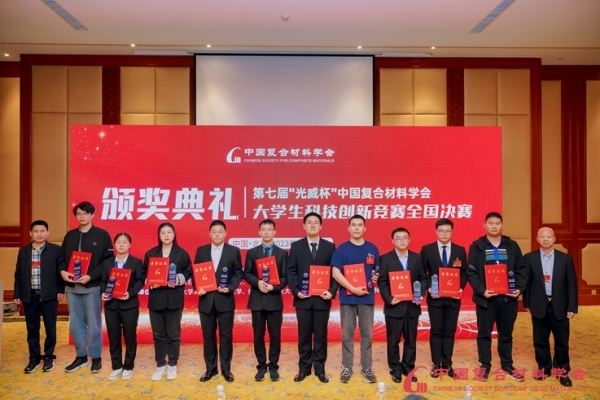 近日,由中国复合材料学会、中国科普研究所、威海市科学技术局等单位主办,由威海光威复合材料股份有限公司、北京理工大学唐山研究院承办的第七届“光威杯”中国复合材料学会大学生科技创新竞赛全国决赛,在北京市国测国际会展中心落下帷幕,并在“中国复合材料学会第八次会员代表大会”现场进行了颁奖仪式。