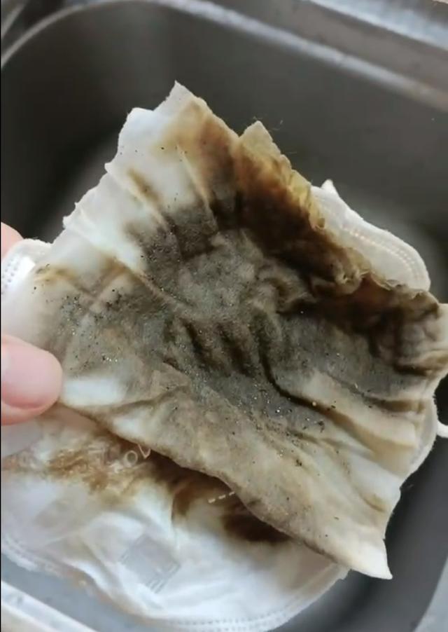 过滤自来水水龙头后,布面上留下大量泥沙。图/视频截图