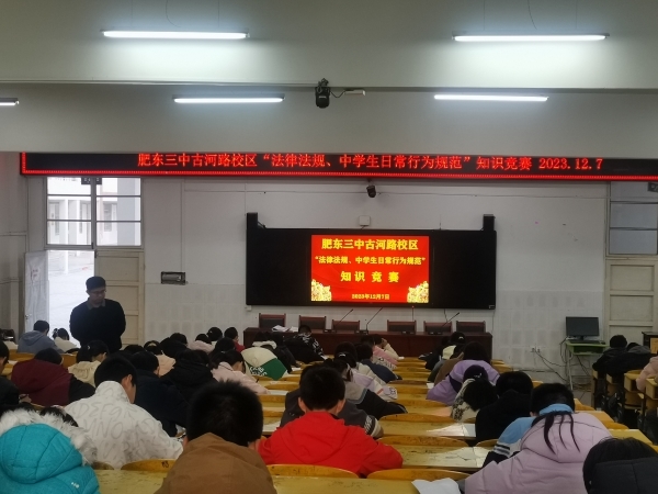 为进一步让学生们理解并积极应对自身安全和行为规范方面的问题,认识到自我保护的重要性,增强自我保护意识和能力,12月7日下午,“法律法规、中学生日常行为规范与自我保护知识”问卷知识竞赛在肥东三中古河路校区阶梯教室一举行。