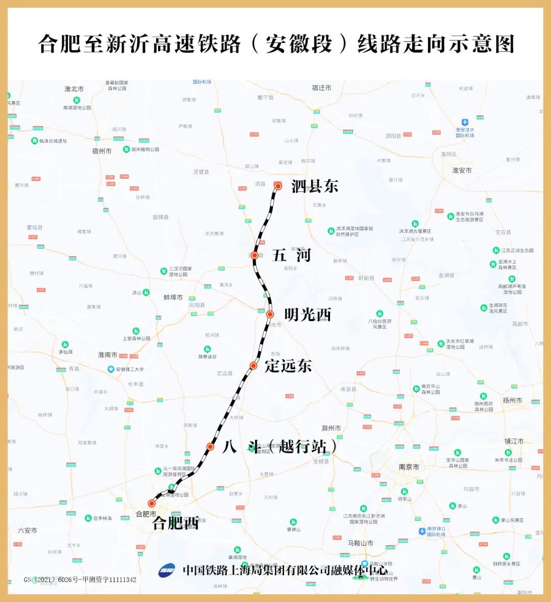 合新高铁起自安徽省合肥市,途经定远县、凤阳县、明光市、五河县、泗县,以及江苏省泗洪县、宿迁市市区,终至新沂市,线路全长约324公里。其中安徽段新建线路198公里,设计时速350公里,共设泗县东、五河、明光西、定远东、八斗(越行)、新合肥西等6个车站,控制性工程为淮河特大桥。