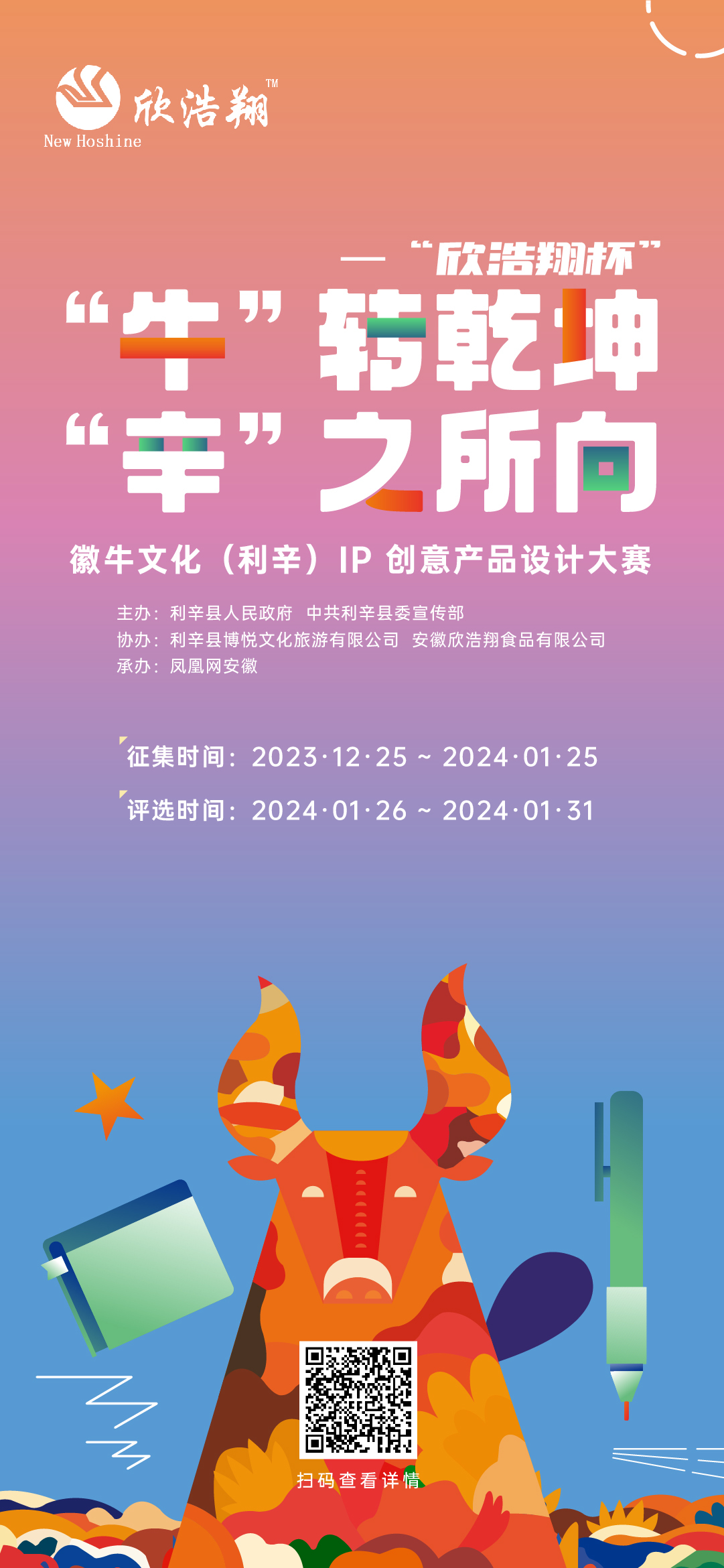 “牛”转乾坤 “辛”之所向——“欣浩翔杯”徽牛文化(利辛)IP 创意产品设计大赛将紧紧围绕地域“徽牛”文化IP形象设计的切实需求,以线上征集的形式汇聚各方创意与智慧,挖掘出一批具有代表性且优质的利辛徽牛文化元素创意产品,展现徽牛文化(利辛)的独特魅力以及利辛县深厚的历史文化底蕴,打造统一、鲜明的品牌传播形象推动利辛县实现新发展、新突破。