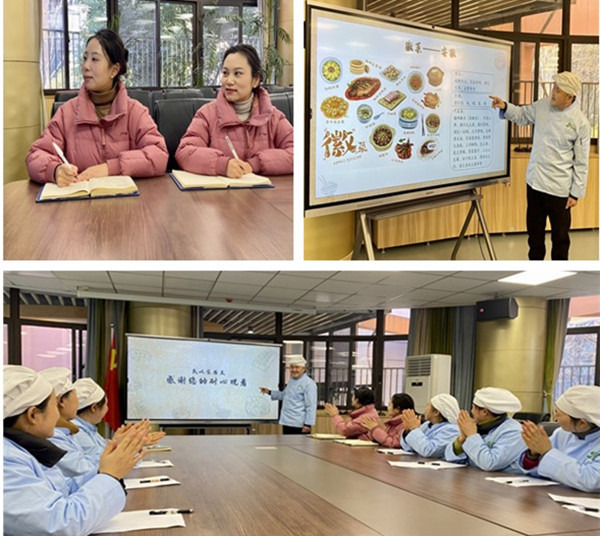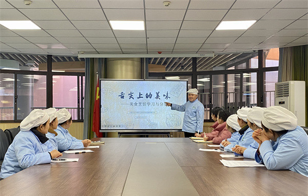 在培训会上,食堂大厨刘家奎分享了烹饪知识和技巧,包括食材选择、刀工、火候掌握和调料搭配,同时也强调了烹饪过程中细节的重要性,并传授了将食材转化为美味佳肴的秘诀。刘大厨还展示了中国的八大菜系并详细介绍了每个菜系的特色和代表菜品。在讲解中餐烹调方法时,他提到了多种烹饪方式,并以图片的形式展示了如何根据不同的食材和菜肴选择合适的烹调方法,并分享健康烹饪的小技巧。在分享交流中每个人都收获颇丰,后勤负责人曹扬老师表示要躬行实践。希望大厨们相互学习后,把烹饪技艺用于实际,用心做好每一餐。