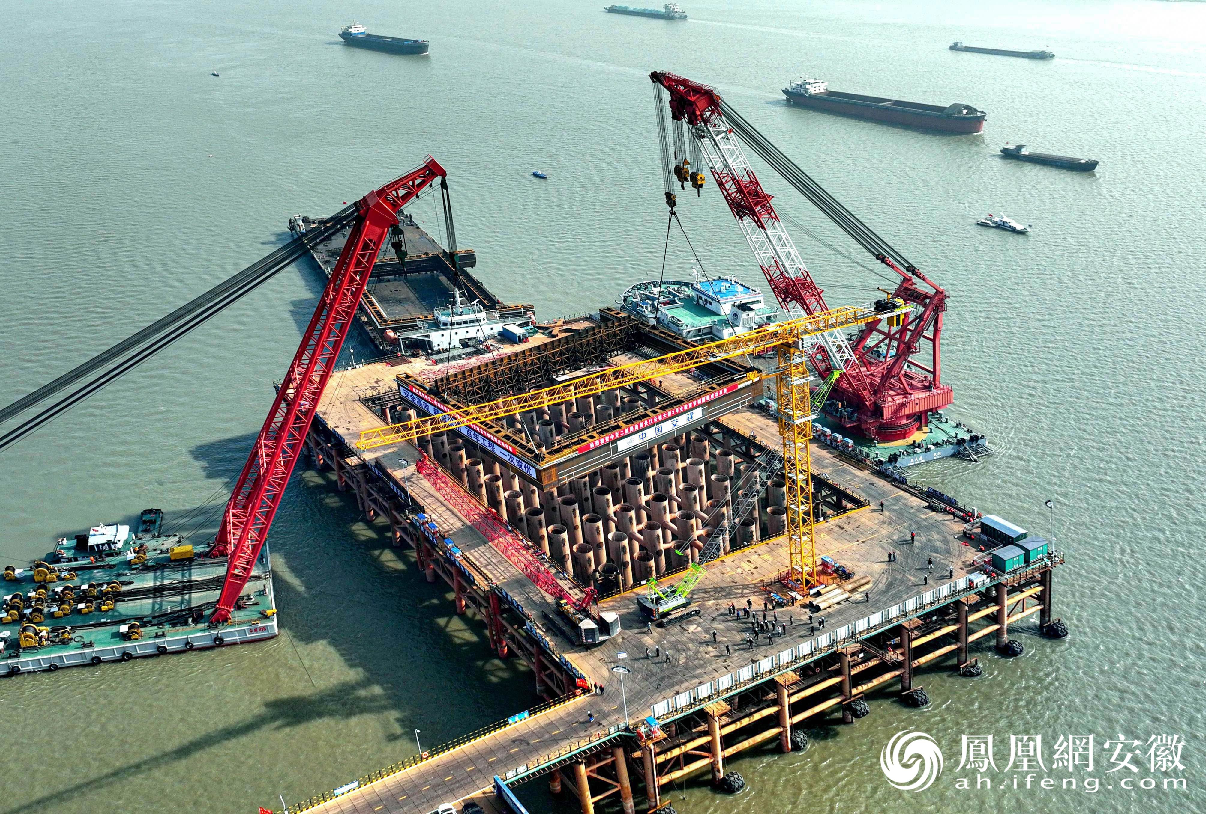 安徽池州长江公铁大桥3号主墩首节钢围堰完成吊装