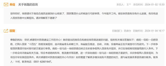 近日,有网民在安徽省发改委风留言咨询,南信合高铁进展到什么程度了,今年能开工吗。南驻阜铁路有没有什么进展?
