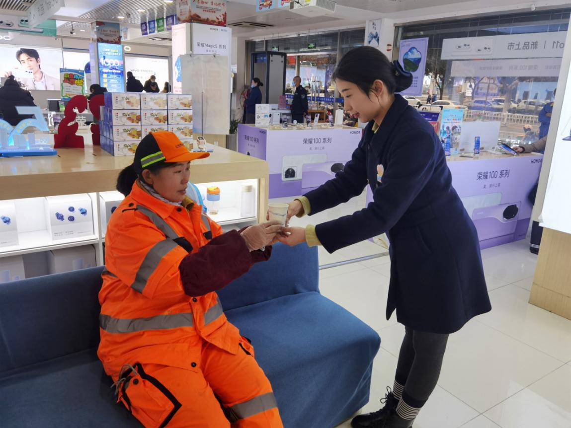 “外面冷,进来喝杯热水吧。”在安徽移动淮北分公司淮海路营业厅内,营业员张朝奕正为路过歇脚的环卫工人递上热水,给户外工作者们送来寒冬里的温暖。寒冬来临,安徽移动打造“暖心驿站”,向环卫工人、快递外卖员等户外劳动者及周边群众提供便民服务,另有微波炉、医药箱、充电等特色服务,打造特色“爱心名片”,把“暖心驿站”打造成为服务户外工作者的暖心阵地和形象窗口。
