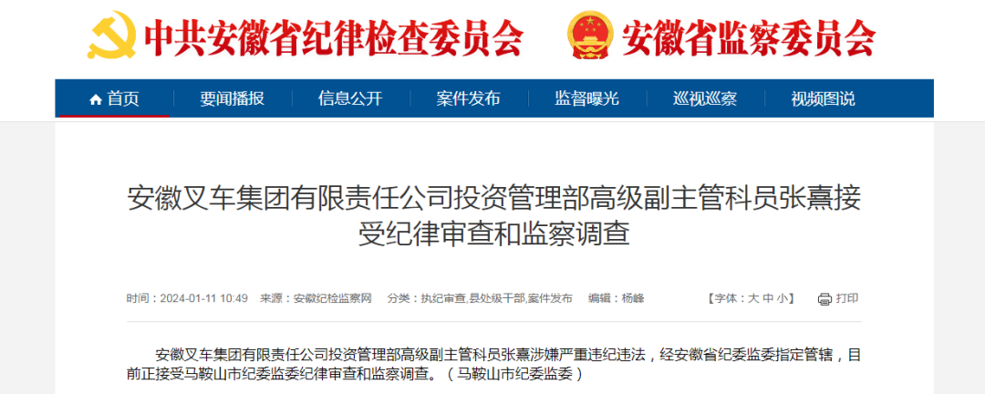 安徽叉车集团有限责任公司投资管理部高级副主管科员张熹涉嫌严重违纪违法,经安徽省纪委监委指定管辖,目前正接受马鞍山市纪委监委纪律审查和监察调查。(马鞍山市纪委监委)