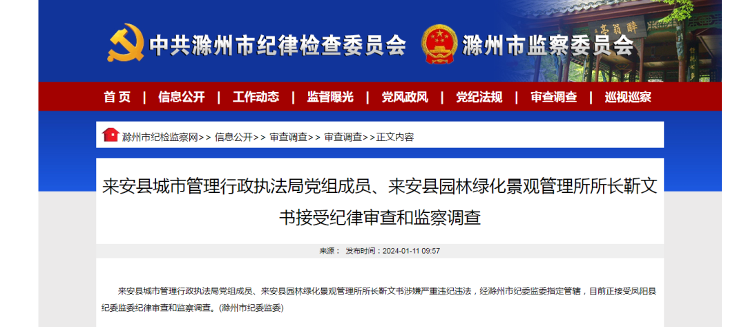 来安县城市管理行政执法局党组成员、来安县园林绿化景观管理所所长靳文书涉嫌严重违纪违法,经滁州市纪委监委指定管辖,目前正接受凤阳县纪委监委纪律审查和监察调查。(滁州市纪委监委)