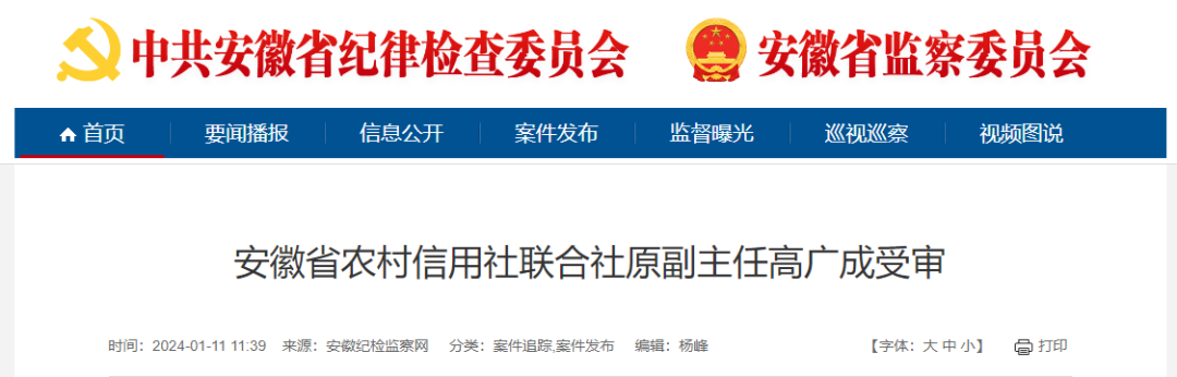 今年1月,据安徽省纪委监委消息:安徽省农村信用社联合社党委委员、副主任高广成涉嫌严重违纪违法,接受纪律审查和监察调查。