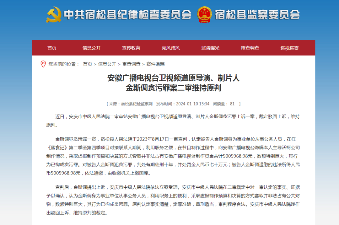 近日,安庆市中级人民法院二审审结安徽广播电视台卫视频道原导演、制片人金斯倜贪污罪上诉一案,裁定驳回上诉,维持原判。