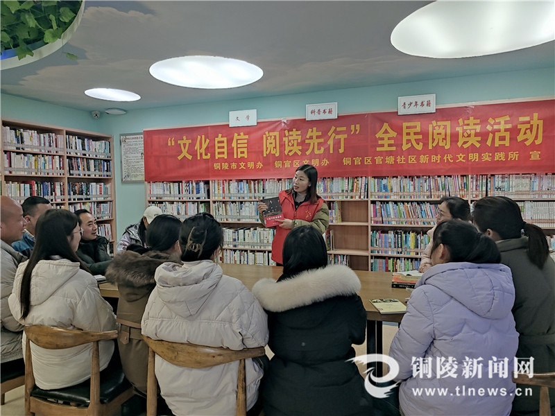 1月19日,在铜陵市铜官区官塘社区活动室,社区志愿者向辖区居民介绍经典书籍。当日,由市文明办、铜官区文明办、官塘社区新时代文明实践所联合主办的“文化自信 阅读先行”全民阅读活动在官塘社区展开。(潘伟 刘利)