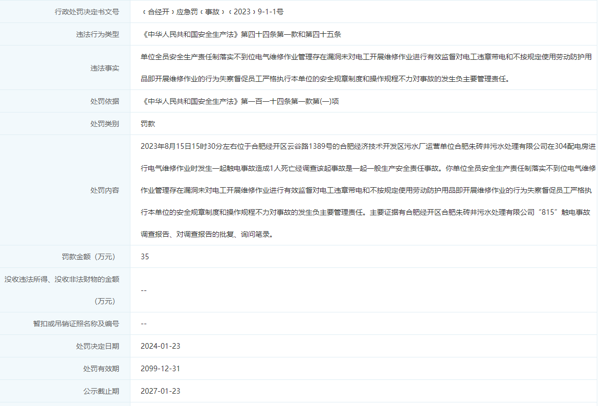 行政处罚决定书﹝合经开﹞应急罚﹝事故﹞﹝2023﹞9-1-1号内容显示,合肥朱砖井污水处理有限公司主要违法事实为,单位全员安全生产责任制落实不到位,电气维修作业管理存在漏洞,未对电工开展维修作业进行有效监督,对电工违章带电和不按规定使用劳动防护用品即开展维修作业的行为失察,督促员工严格执行本单位的安全规章制度和操作规程不力,对事故的发生负主要管理责任。