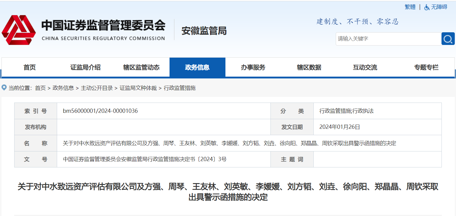 据安徽证监局1月26日披露,因内部治理、质量控制体系、独立性以及在多个项目中存在问题,中水致远资产评估有限公司(简称“中水致远”)及方强等10名签字评估师被出具警示函。