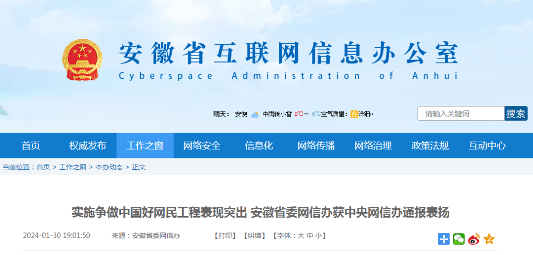 1月30日,中央网信办召开2024年争做中国好网民工程视频推进会,安徽省委网信办等14家省(市、区)网信办和4家网站平台作为2023年实施争做中国好网民工程表现突出单位,受到通报表扬。