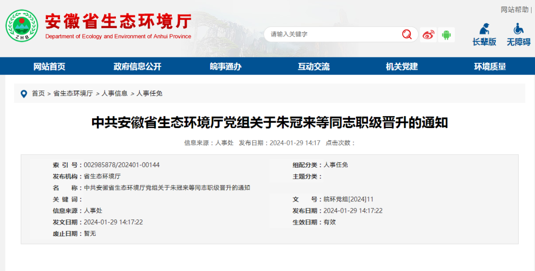 朱冠来同志晋升为六安市生态环境局三级调研员;