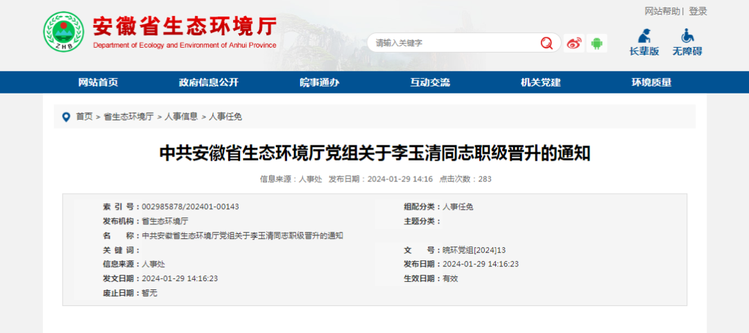 李玉清同志晋升为宿州市生态环境局二级调研员。