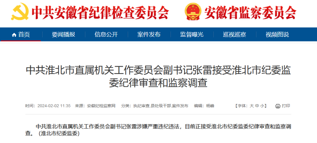 中共淮北市直属机关工作委员会副书记张雷涉嫌严重违纪违法,目前正接受淮北市纪委监委纪律审查和监察调查。(淮北市纪委监委)