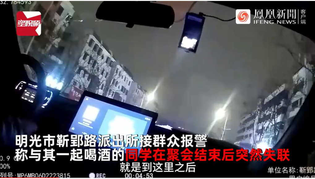 2月2日,安徽明光市靳郢路派出所民警接到群众报警,称与其一起喝酒的同学在聚会结束后突然失联,明光市民警紧急寻找,经过一小时的努力,民警最终要一小区居民楼内找到该男子。被找到时,该男子全身赤裸,昏睡在地,因长时间受冻,民警协助男子家人将其送往医院检查,因送医及时,目前该男子无生命危险。滁州一男子雪天聚餐醉酒失踪,同学急到报警,找到时全身赤裸昏睡在楼道.