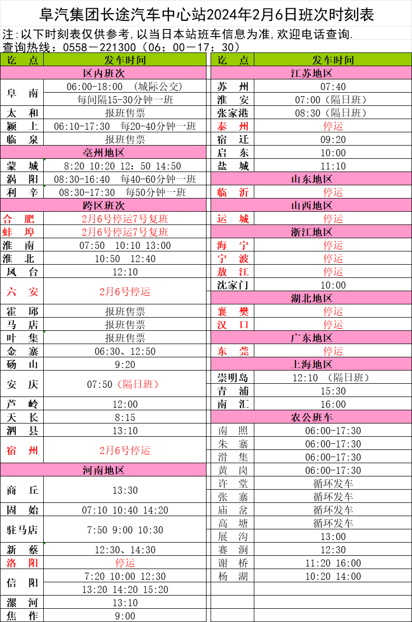 前期受低温雨雪冰冻天气影响,阜阳长途汽车中心站暂时关闭停运,现部分道路已具备通行条件,2月6日起站内班车复班运营情况如下,如有疑问请电话咨询0558-2213000。