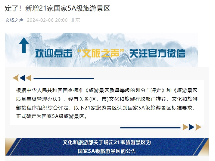 文化和旅游部6日消息,根据中华人民共和国国家标准《旅游景区质量等级的划分与评定》和《旅游景区质量等级管理办法》,经有关省(区、市)文化和旅游行政部门推荐,综合评定21家旅游景区达到国家5A级旅游景区标准要求,正式确定为国家5A级旅游景区。