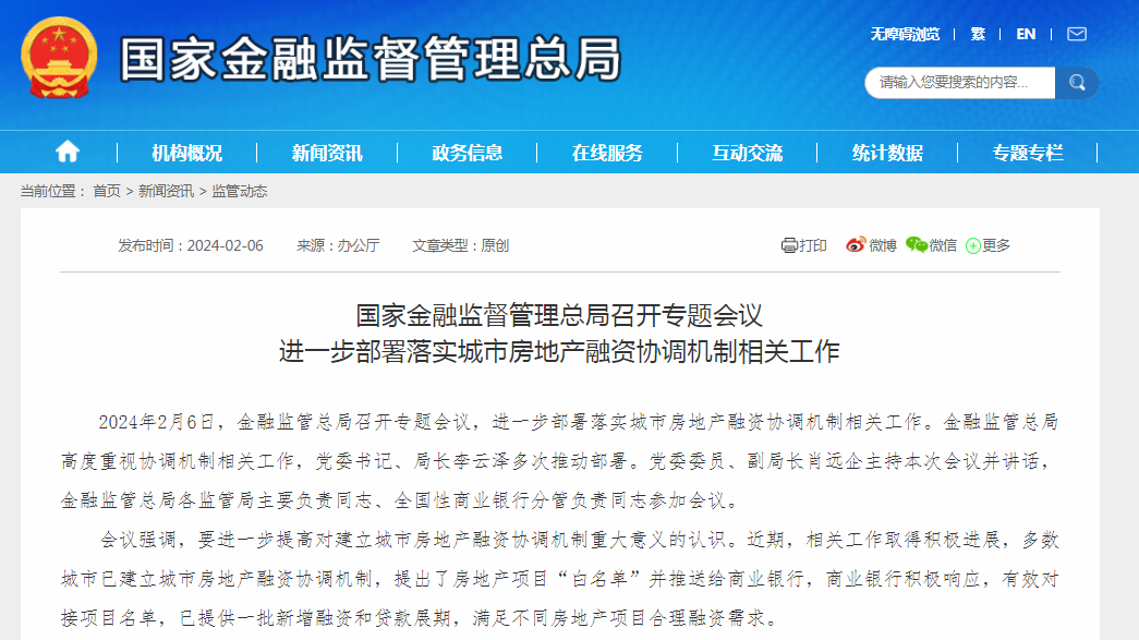 同样是在2月6日,国家金融监管总局召开专题会议,进一步部署落实城市房地产融资协调机制相关工作。金融监管总局高度重视协调机制相关工作,党委书记、局长李云泽多次推动部署。