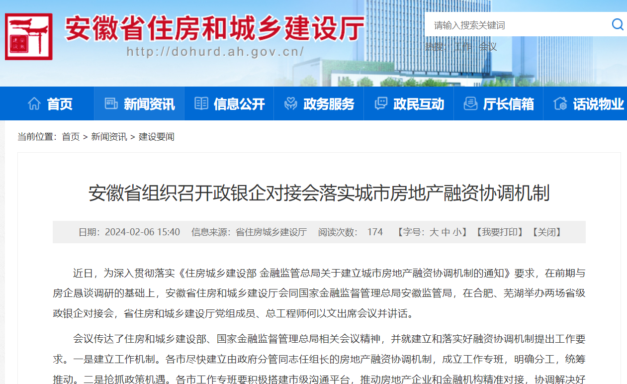 据安徽省住建厅官网2月6日消息,在前期与房企恳谈调研的基础上,安徽省住建厅会同国家金融监督管理总局安徽监管局,近日在合肥、芜湖举办两场省级政银企对接会。全省16个市住房城乡建设(房管)部门和金融监管分局,以及85家房地产开发企业、57家银行金融机构参加了会议。