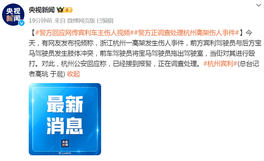 2月25日,有网友发布视频称,浙江杭州一高架发生伤人事件,前方宾利驾驶员与后方宝马驾驶员发生肢体冲突,前车驾驶员将宝马驾驶员拖出驾驶室,当街对其进行殴打。