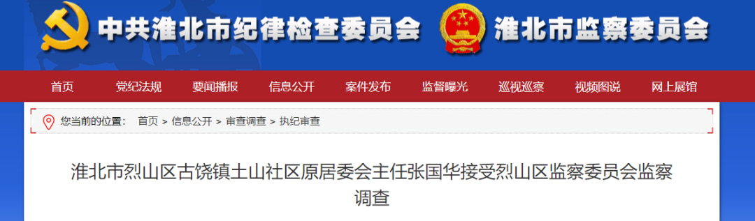 淮北市烈山区古饶镇土山社区原居委会主任张国华涉嫌严重职务违法 ,目前正在接受烈山区监察委员会监察调查。(烈山区纪委监委)