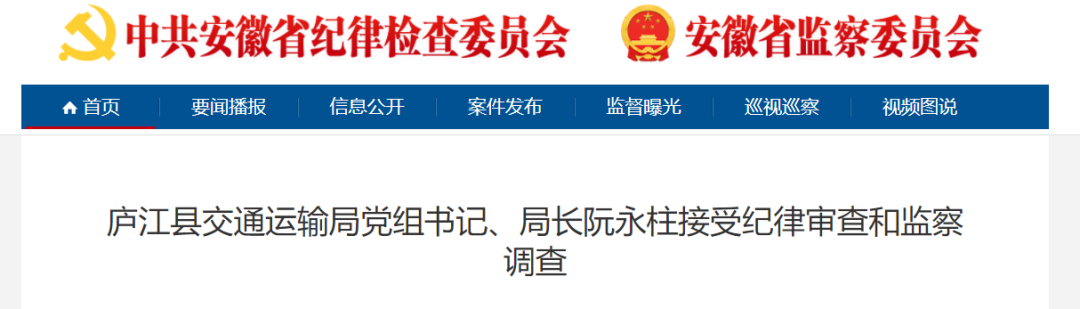 庐江县交通运输局党组书记、局长阮永柱涉嫌严重违纪违法 ,目前正接受庐江县纪委监委纪律审查和监察调查。(庐江县纪委监委)