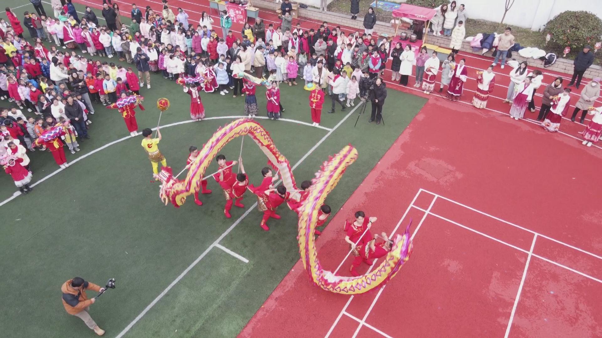 在屯溪现代实验学校文峰桥校区,欢歌笑语在操场上空回荡,一条精神抖擞的龙正在操场盘旋,师生家长的叫好声把表演推上了高潮。