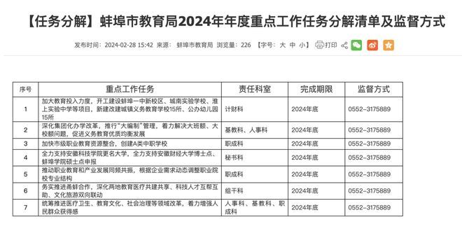 日前,蚌埠市教育局官网公布2024年年度重点工作任务分解清单及监督方式。其中包括:全力支持安徽科技学院更名大学,全力支持安徽财经大学博士点、蚌埠学院硕士点申报。