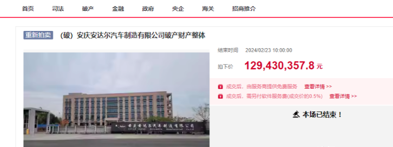 2月23日,安庆安达尔汽车制造有限公司破产资产再次迎来了整体被拍卖,起拍价1.2943亿元,最终只有一个人报名竞拍,以起拍价拿下了这宗破产资产。