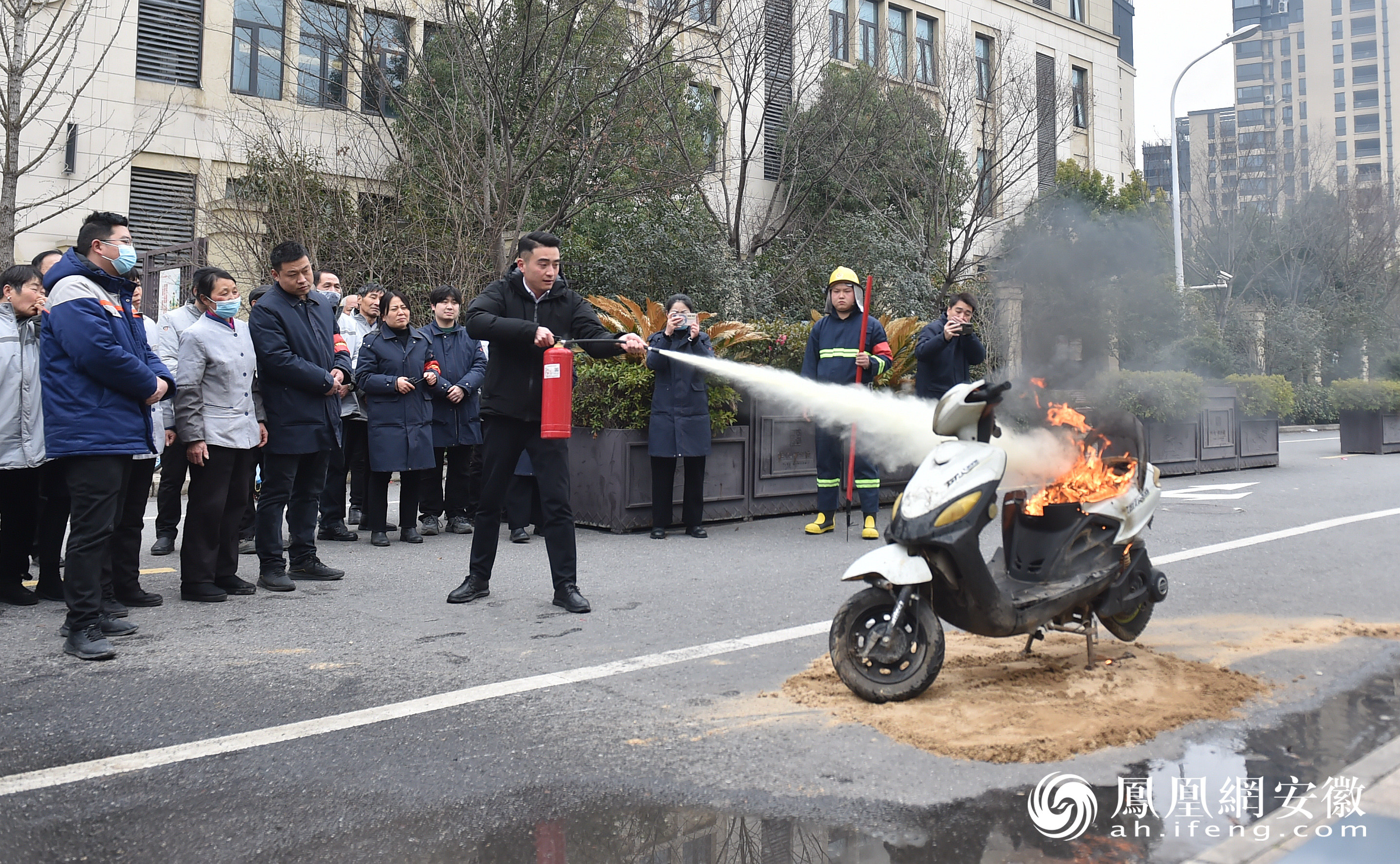 2024年2月26日,在安徽省合肥市庐阳区大杨镇铂悦庐州府麓园小区,物业人员对着火的电动车进行灭火。(凤凰网安徽特约摄影师 葛传红 李燕阳/摄)