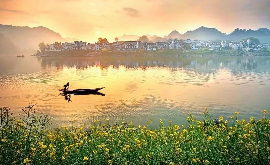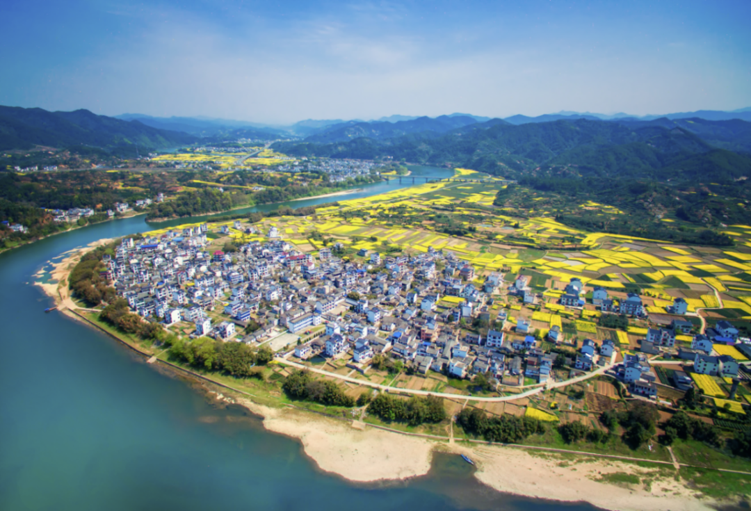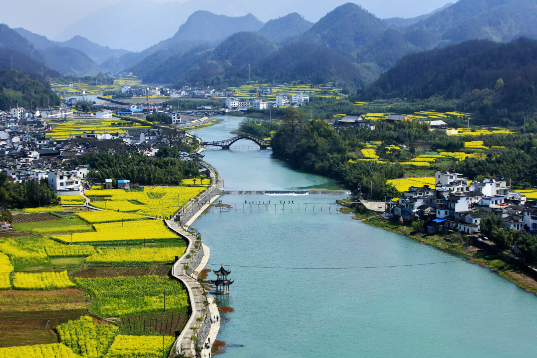 自坑口乡至深渡镇,两岸群山连绵,郁郁葱葱,白墙黛瓦的徽式民居散落其间。绕江而行,无论是自驾还是漫步,都能见到花田生机勃勃,村落古色古香,与清澈江水相得益彰。