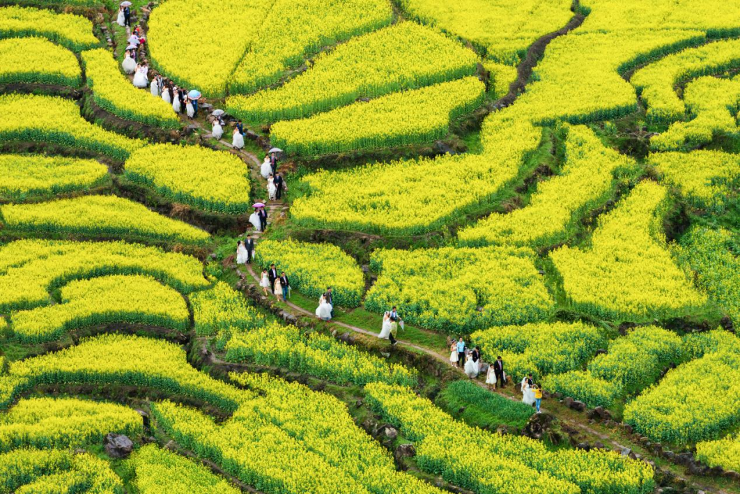 层层叠叠的梯田,将油菜花排列得颇有层次感。沿着山间小道一路向上,碧绿与金黄交织,油画般的世界在眼前缓缓铺陈。置身其中,只觉花香早已浸润了整个山谷,沁人心脾。