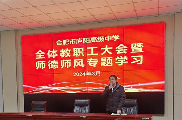 为切实落实省、市、区教育主管部门的相关会议精神和工作要求,进一步增强师生安全意识,加强师德师风建设,确保学校稳定和谐,推进高质量发展,合肥市庐阳高级中学于近期相继召开全体教职工安全工作和师德师风专题会议。学校党委书记、校长裴劲,副校长杨怀明、武剑出席,并进行工作传达、布置和要求。