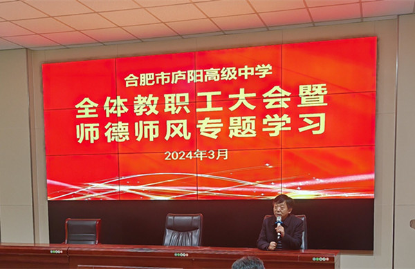 师德师风专题会议向全体教职工传达了市、区教育主管部门的相关要求,并在常规管理、教育科研、家校共育等方面作具体布置。裴劲强调,庐阳高中教职工要提高政治站位,加强理论学习,弘扬“教育家精神”,成长为有情怀、有水平、有温度的好老师、大先生,用自己的行为示范做好学生的引路人,让孩子们在学校感受到更美好的成长陪伴。