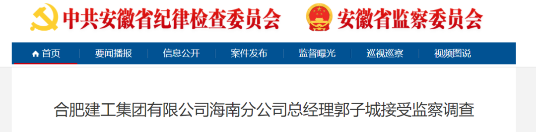 合肥建工集团有限公司海南分公司总经理郭子城涉嫌严重违法 ,经安徽省监察委员会和滁州市监察委员会指定管辖,目前正接受滁州市全椒县监察委员会监察调查。(滁州市纪委监委)