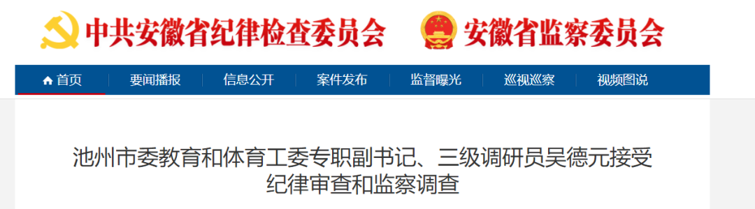 池州市委教育和体育工委专职副书记、三级调研员吴德元涉嫌严重违纪违法 ,目前正接受池州市纪委监委纪律审查和监察调查。(池州市纪委监委)
