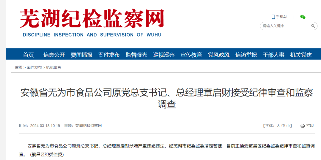 安徽省无为市食品公司原党总支书记、总经理章启财涉嫌严重违纪违法 ,经芜湖市纪委监委指定管辖,目前正接受繁昌区纪委监委纪律审查和监察调查。(繁昌区纪委监委)